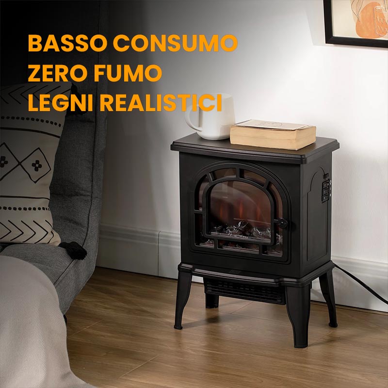 Effetto Camino con legna realistica effetto bruciacchiato con timer e controllo temperatura comandabili da remoto. Rende i tuoi ambienti accoglienti ed eleganti e il vetro non scotta. Consuma solo 0,8KWh